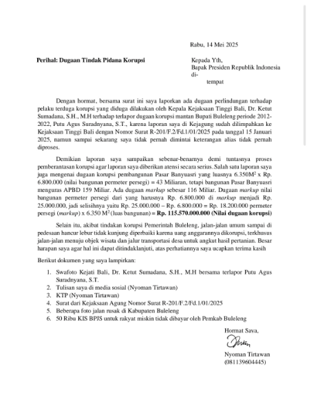 Bali || Gardatipikornews.com -- Pada Hari Rabu, 14 Mei 2025, Nyoman Tirtawan Tokoh Masyarakat Buleleng yang Mantan Anggota DPRD Bali mengirim surat Kepada Yth, Bapak Presiden Republik Indonesia di Jakarta.